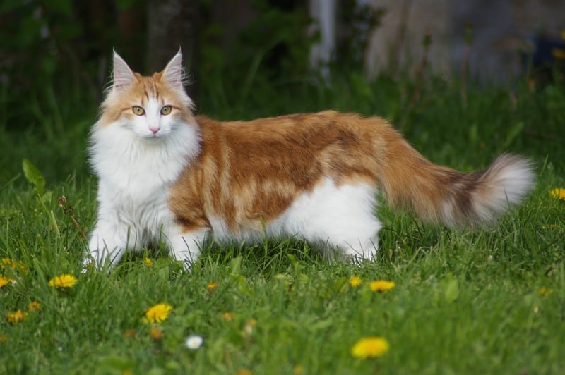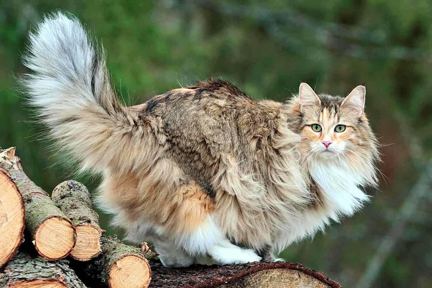 Norwegian Forest cats are known for their majestic appearance, tufted ears, bushy tails, and a thick, water-resistant double coat.