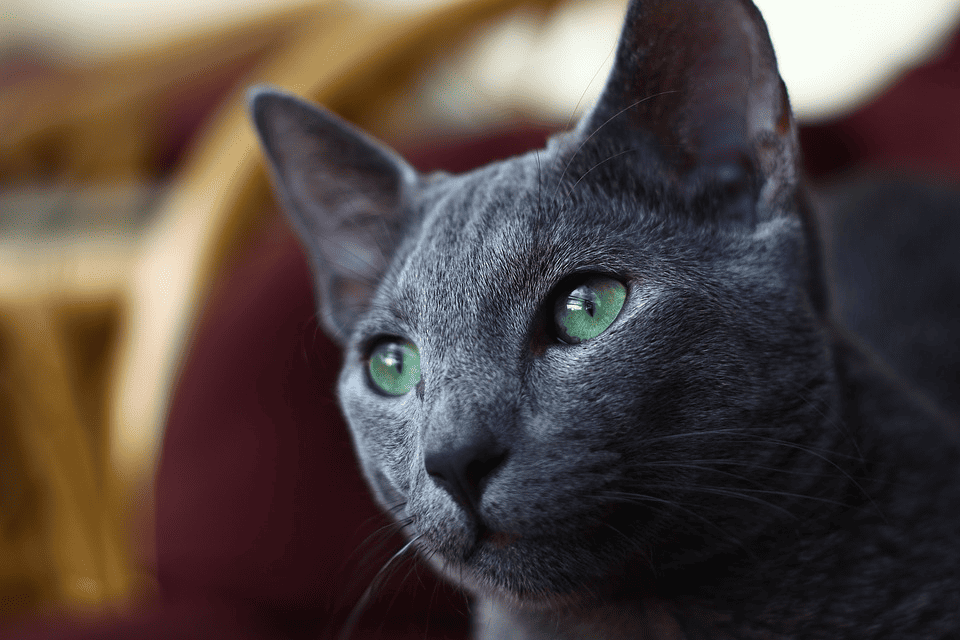 Russian Blues have a sleek and elegant appearance with a short, dense coat that lies close to their body. Their coat color is a striking silver-blue, and their eyes, large and almond-shaped, are a vibrant green. The overall effect is a cat with a sophisticated and aristocratic presence.